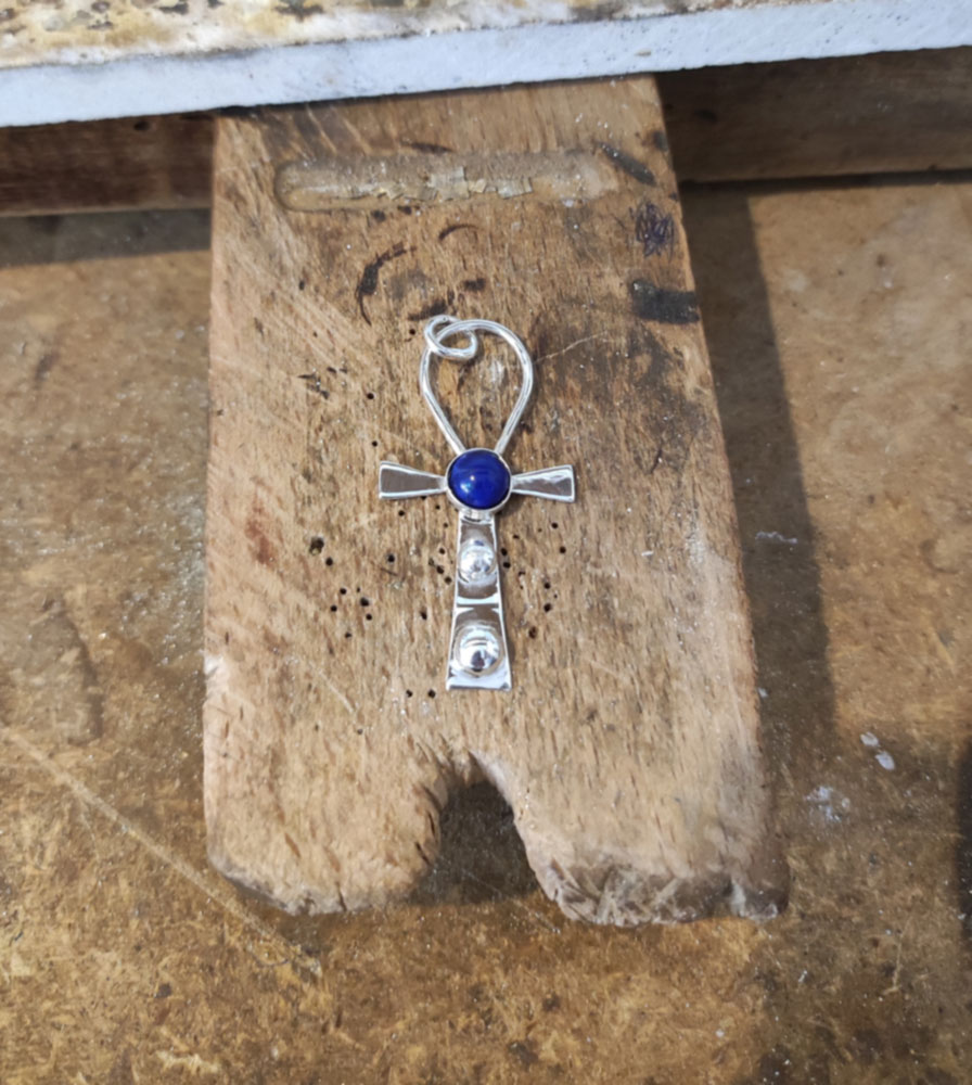 Colgante Ankh, cruz egipcia hecha en plata de ley 925 y lapislázuli, hecha a mano.