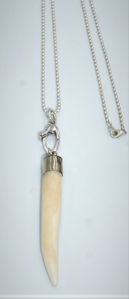 Material: Collar de plata de ley 925 y mosquetón de plata Ley 925 con baño de rodio y colmillo natural.
