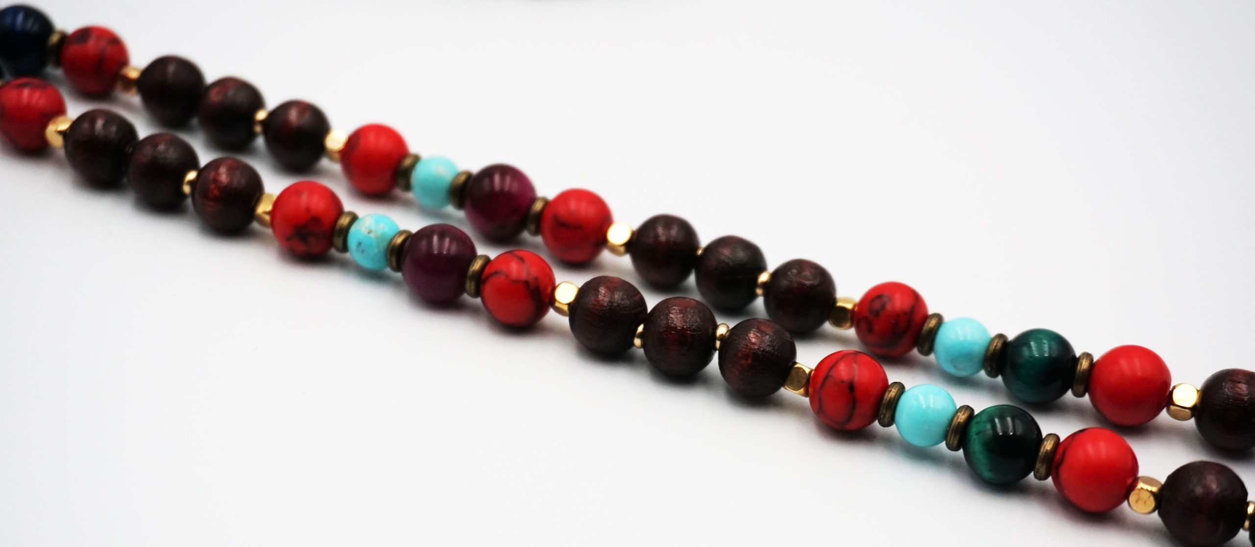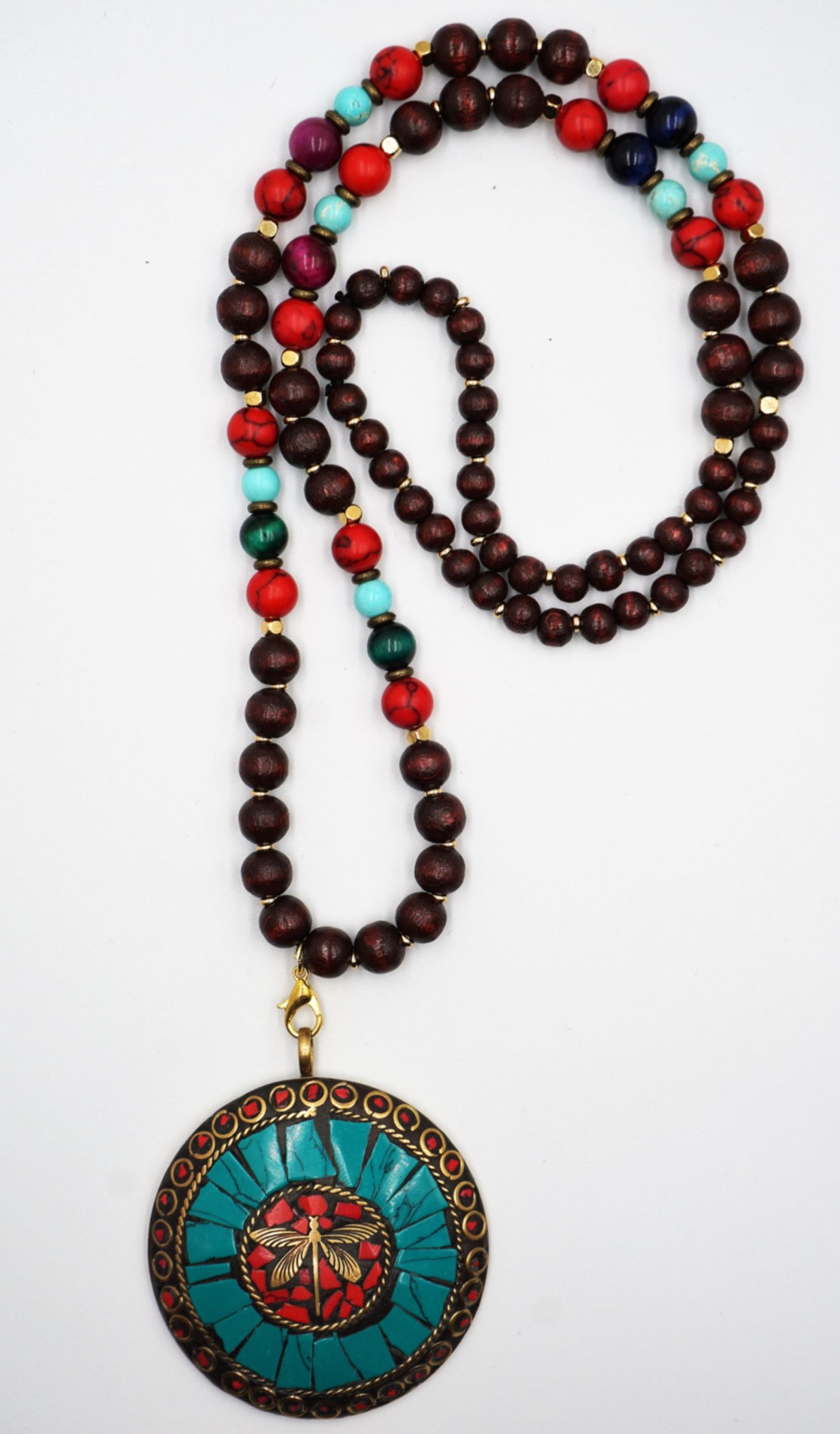 Collar de abalorios de madera, piedra ojo de tigre y zamak con medallón de minerales en forma de libélula en color verde.