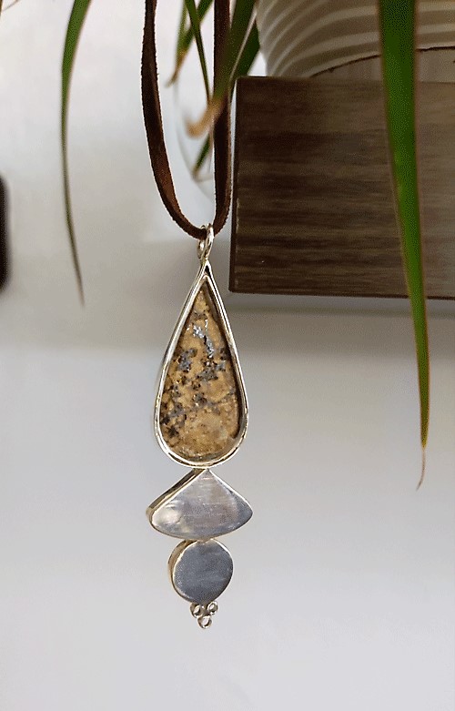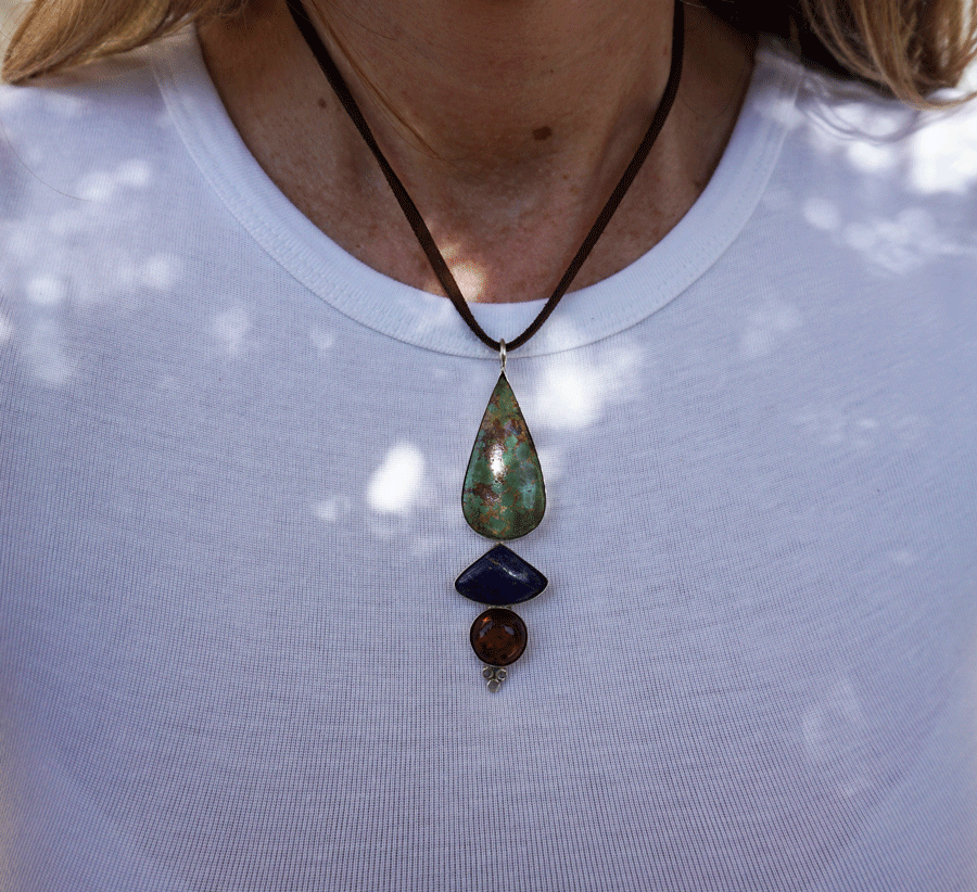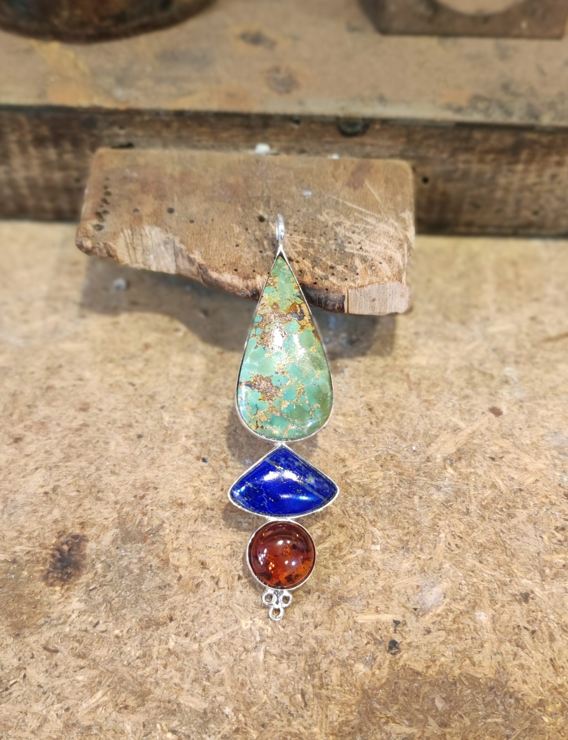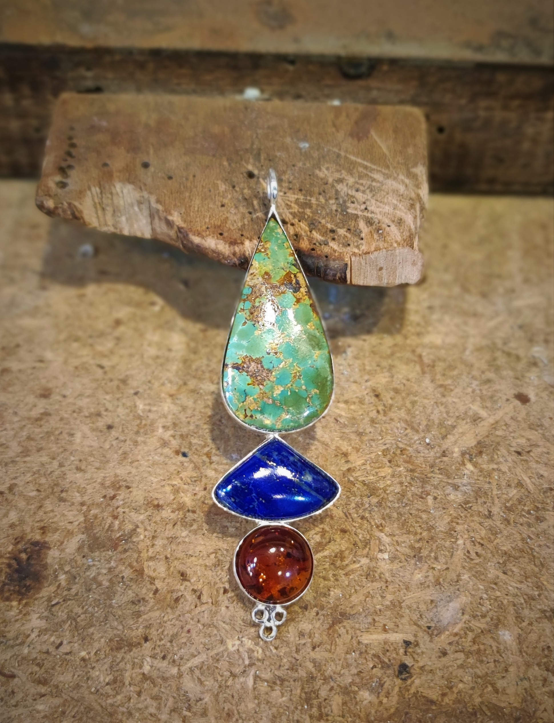 Se trata de un hermoso colgante hecho de manera artesanal de turquesa natural iraní de Nishapur (donde se encuentra la mejor calidad en turquesas), lapislázuli afgano y ámbar de Mar Báltico, unidos en una única pieza en plata de ley 925.